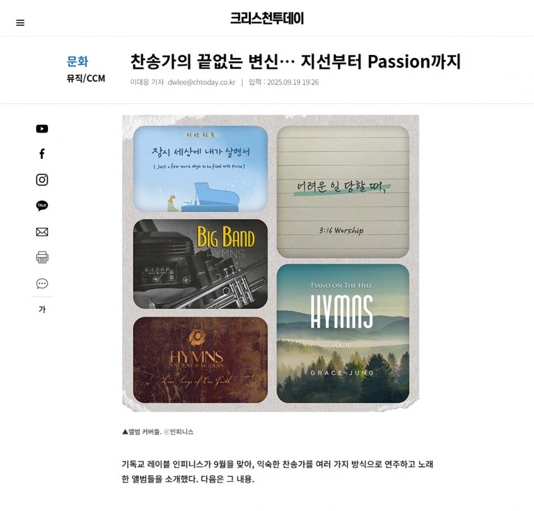 기독교 레이블 인피니스가 9월을 맞아, 익숙한 찬송가를 여러 가지 방식으로 연주하고 노래한 앨범들을 소개했다. 다음은 그 내용.