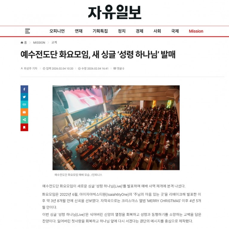 [기사] 예수전도단 화요모임, 새 싱글 ‘성령 하나님’ 발매(자유일보)