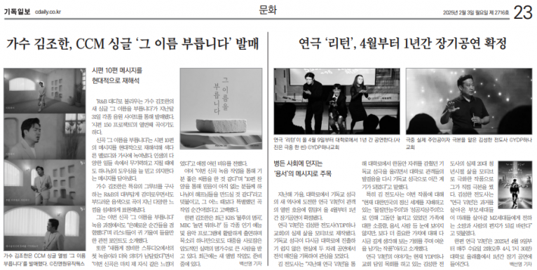 [기사] 가수 김조한, CCM 싱글 '그 이름 부릅니다' 발매(기독일보)