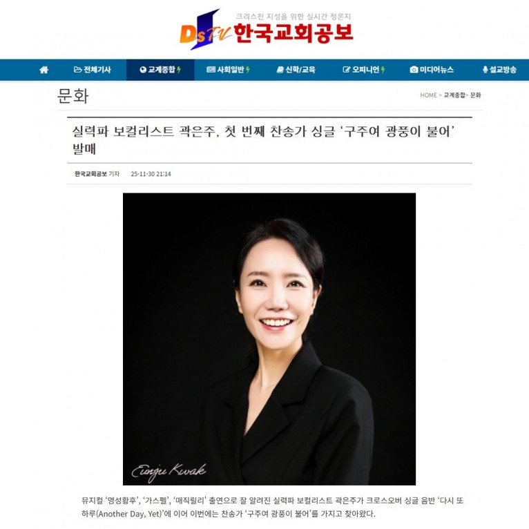 뮤직타임 [기사] 실력파 보컬리스트 곽은주, 첫 번째 찬송가 싱글 ‘구주여 광풍이 불어’ 발매(한국교회공보)