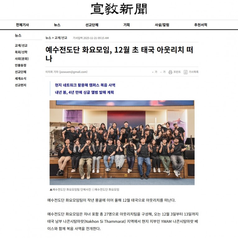 [기사] 예수전도단 화요모임, 12월 초 태국 아웃리치 떠나(선교신문)