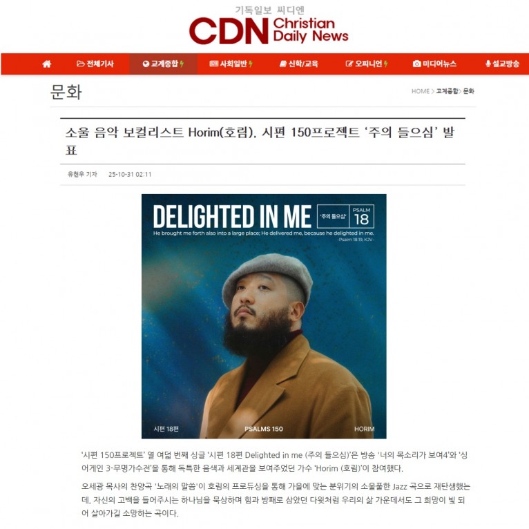 [기사] 소울 음악 보컬리스트 Horim(호림), 시편 150프로젝트 ‘주의 들으심’ 발표(기독일보 씨디엔)