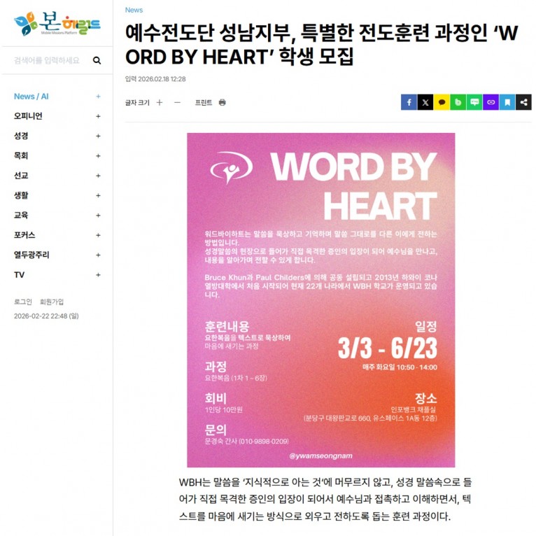 [기사] 예수전도단 성남지부, 특별한 전도훈련 과정인 ‘WORD BY HEART’ 학생 모집(본헤럴드)